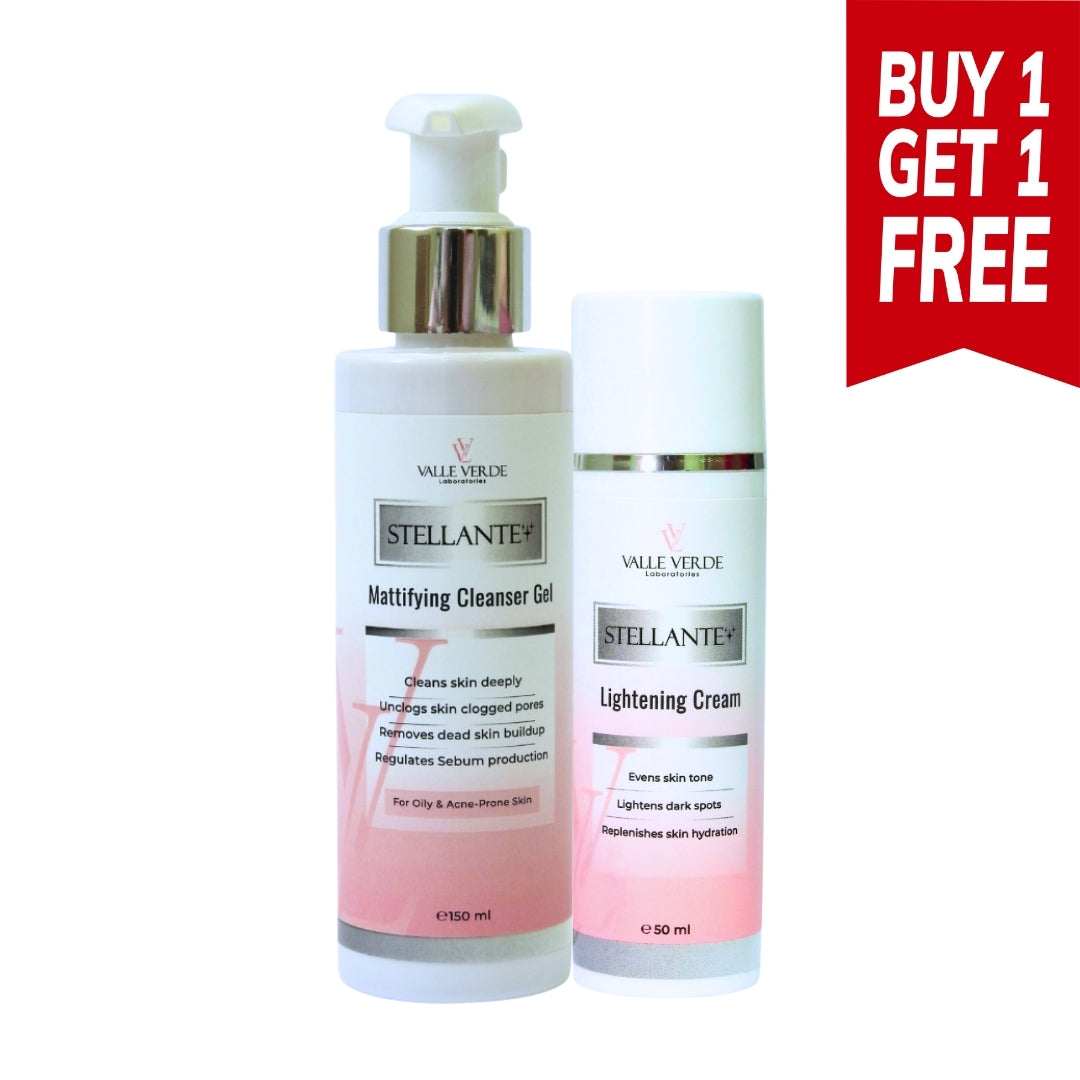 The Stellante Matte Bright Duo delivers two essential benefits for oily and uneven skin: effective oil control and visible brightening. This duo pairs the Mattifying Cleanser with the Lightening Cream to purify pores, reduce shine, and fade dark spots. Together, they leave your skin clearer, smoother, and more balanced.